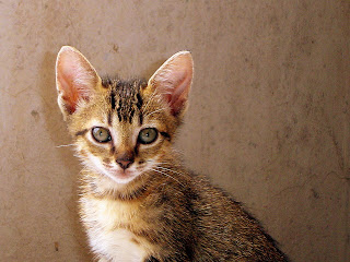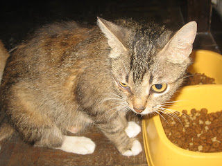 Te cuento, este gatito que apenas tiene un mes, es ciego totalmente, la veterinaria esta casi segura que es una hembrita pero hay dudas,ya sabes,al ser tan peque...el caso es que fue rescatado de un jardín donde parió su madre y donde no los quieren, lo tengo yo en acogida. Te cuento que para mi es un caso muy especial pero no solo por que es ciego,sino por que no deja de sorprenderme lo listo y superviviente que es a su corta edad, es un enano/a, he tenido siempre muchos gatos pero te aseguro que este es especial,por lo bueno,cariñoso/a,